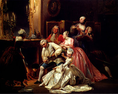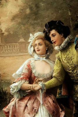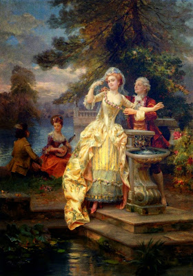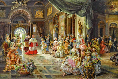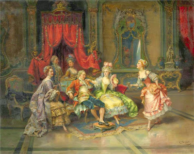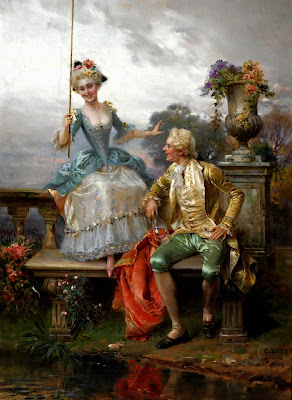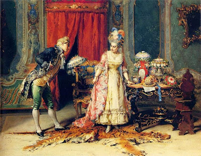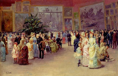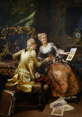 This type of painting was inspired in part by eighteenth century rococo paintings of both rural and urban daily life; however, nineteenth century artists such as Detti incorporated new elements reflecting the Realist movement of the 1850s and 60s in both subject matter and style. A painting such as Flowers for Her Ladyship depict a cavalier presenting a bouquet to an elaborated gowned woman, but the setting for this encounter looks more like an overwrought rococo revival room than an elegant eighteenth century interior; and that sense of humor is part of the appeal. In a more modern mode, Detti also painted works such as Varnishing Day, a painting that shows contemporary Parisians witnessing the final varnishing of oil paintings just days before the opening of the annual Salon. Canvases like this give the viewer a glimpse of real life in the late 1870s very much in the naturalist style of forward-looking artists throughout Europe.
