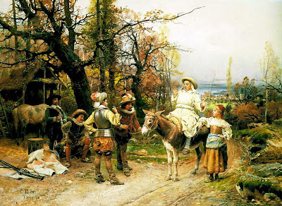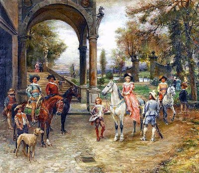 Detti seems to have settled comfortably into life in Paris. He exhibited at the Salon des Artistes Français beginning in 1877, showing La Cinquantaini (Golden Wedding Anniversary) that year, and in 1878 exhibiting La Rixe (The Brawl) at the Exposition Universelle. In addition, his work came to the attention of William Henry Vanderbilt, the American railroad tycoon, who purchased a number of Detti’s paintings directly from the artist. It was probably his meeting with Juliette-Emilie Filieuse, however, that persuaded Detti to remain in France permanently. He had met Mlle Filieuse through her brother Augustine, and married her in 1880. In quick succession over the next few years, they had two daughters and a son, and in 1883, the family moved to the village of Marlotte outside of Paris.The decade of the 1880s was one of expansion in Detti’s career. He undertook at least two book illustration projects for the publishing firm of Firmin. The first was the 1886 edition of Sir Walter Scott’s The Abbot (published as L’Abbé in French) first published in 1820; and the second was an 1888 edition of Scott’s The Fair Maid of Perth (La Jolie Fille de Perth) which was originally published in 1828. With his skill at depicting costume pieces from historical eras, it is not surprising that Detti would have been asked to design illustrations for these romantic English novels.